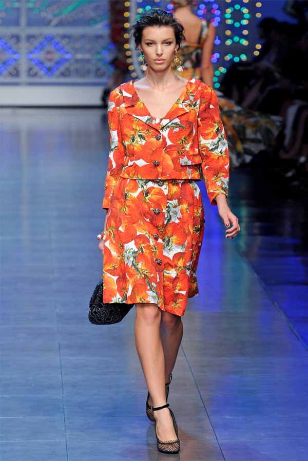 Она начинается с серии платьев-бюстье с принтами из ингредиентов средиземноморской кухни: помидорами, перцами и баклажанами, все это с сочной передачей отображается на платьях, шортах и брюках. Веселая и энергичная женственность в коллекции от Dolce & Gabbana на весну-лето 2012, вторгается на подиум с украшенными цветами и полными обольщения полупрозрачными нарядами.